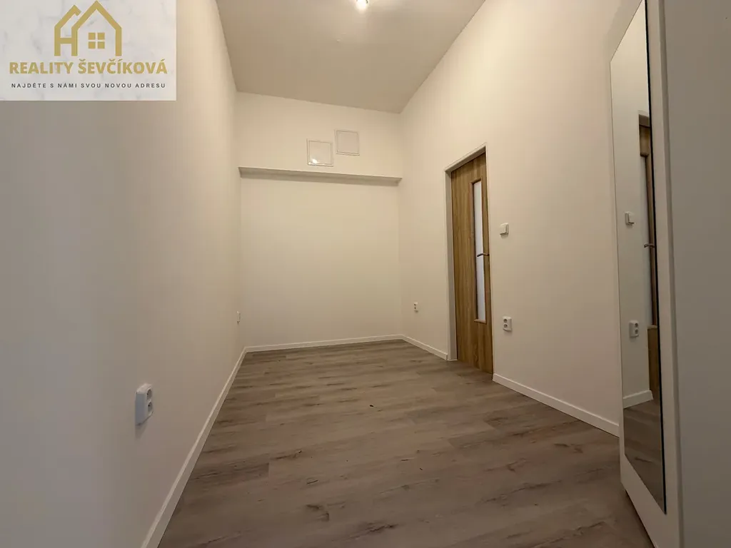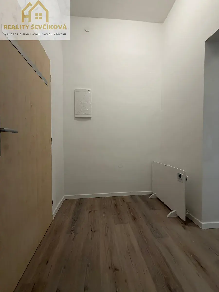 Dispozice: vstupní chodba, koupelna se sprchovým koutem na kterou navazuje samostatné WC, kuchyň, prostorný obývací pokoj a menší ložnice.
