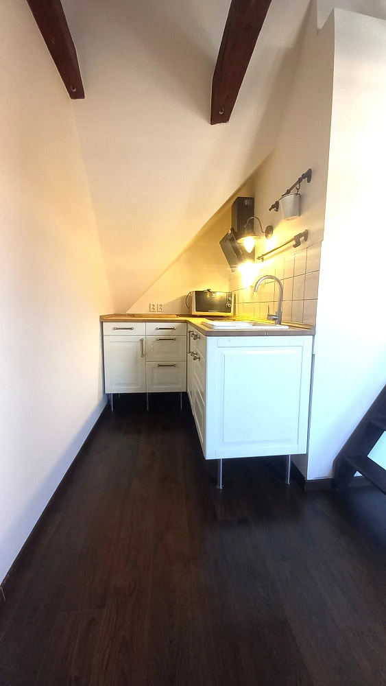 Nabízím k prodej atraktivní podkrovní byt v OV s dispozicí 1+kk o celkové podlahové ploše 41 m² (37m² + 4m² galerie na spaní), který se nachází ve 3. patře zrekonstruovaného cihlového bytového domu (schůze SVJ schválila výstavbu výtahu z dotačního titulu v roce 2026) v ulici Novovysočanská na Praze 9. Byt se skládá z velkého světlého pokoje o ploše 30 m² (vybavený nábytkem) s kuchyňským koutem, předsíní a dále koupelnou se sprchovým koutem a toaletou. V pokoji je podkrovní galerie pro pohodlné spaní 2 osob. Byt i dům prošel kvalitní rekonstrukcí, nová střecha, okna, fasáda, společné prostory domu. V domě je uzavřené atrium, kde je možné posedět i pogrilovat. Bezproblémové parkování pro rezidenty u domu. Přímo u autobusové zastávky Skloněná, pár minut od metra Vysočanská či Palmovka. Jedinečná poloha nedaleko parku Krejcárek, který poskytuje dokonalé sportovní vyžití (venkovní posilovna, discgolfové i dětské hřiště, tenisový areál, fotbal…). Velmi nízké provozní náklady (pouze 2.400,-Kč + elektřina), atraktivní i jako investice k pronájmu – byt je možno okamžitě pronajímat (prodává se kompletně vybaven, včetně všech spotřebičů). Neváhejte a domluvte si prohlídku ještě dnes. Pro více informací mě neváhejte kontaktovat. Není problém zajistit kvalitní hypoteční financování