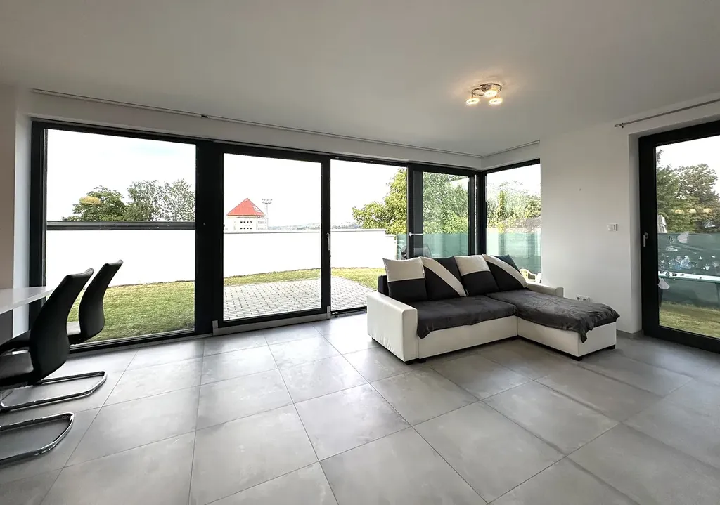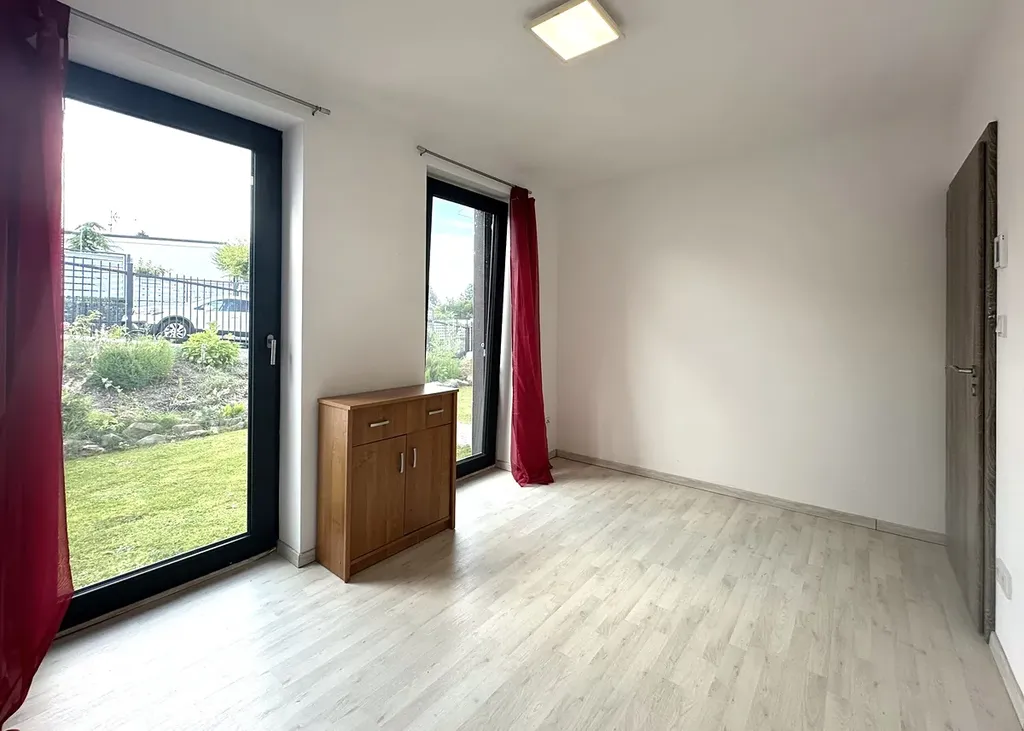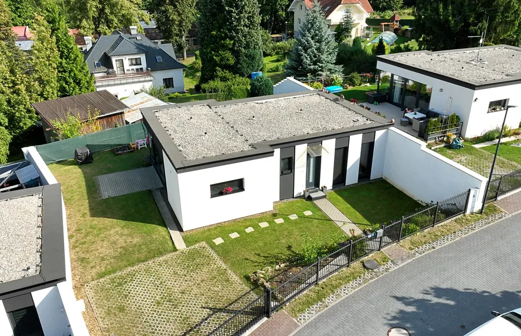 Všechny místnosti domu se nachází v jednom podlaží. Dům je dispozičně řešen vstupní předsíní, chodbou, obývacím pokojem s kuchyňským koutem, ložnicí, dětským pokojem a pracovnou. Koupelna je vybavena sprchovým koutem a toaletou. Ze všech pokojů je možný vstup na terasu. V celém bytě je položena snadno udržovatelná dlažba a laminátová podlaha. O teplo se stará elektrické podlahové topení ovládané centrálně nebo jednotlivě. Dům je také připojen na veřejný vodovod a kanalizaci. Součástí nemovitosti je zahrada, kovaný plot a dálkově ovládaná pojezdová brána. Možnost parkování na pozemku nebo před domem.