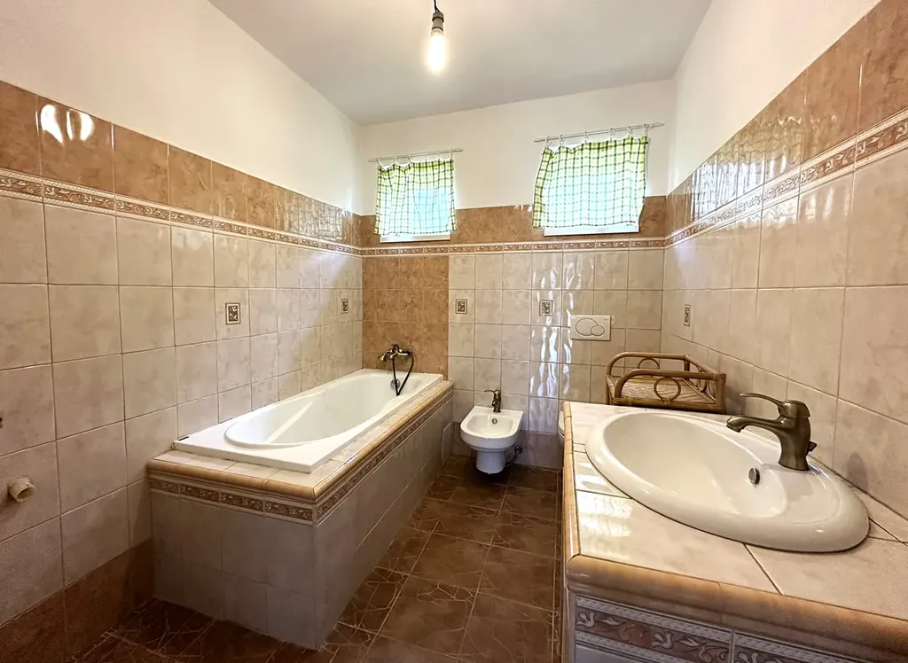 Součástí prodeje je sklep (11.70 m²), dvojgaráž s elektrickými vraty a dílnou (43 m²), dále zahrada o výměře 494 m² se zahradním domkem a bazénem. Celková plocha pozemku činí 626 m², zastavěná plocha domu je 132 m².
