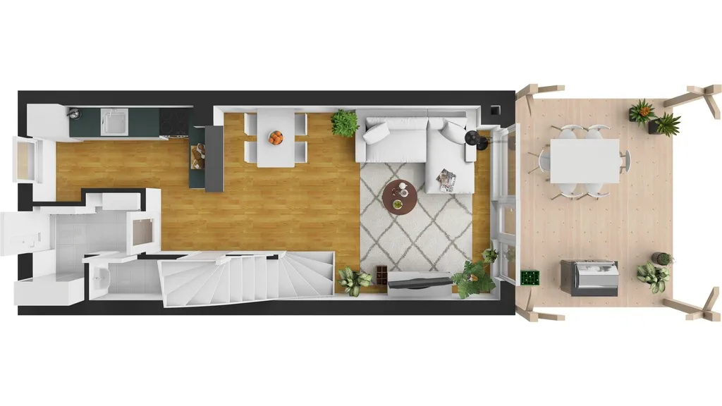 Dům má velmi praktické uspořádání. V přízemí domu je propojený obývací pokoj se vstupem na terasu s jídelním koutem a kuchyní. Ta je vybavena kuchyňskou linkou se spotřebiči. Dále je zde úložná komora a toaleta. V patře domu jsou dva pokoje. Jedna ložnice je vybavená vestavnými skříněmi. Je zde koupelna s vanou a prostorem pro pračku i sušičku.