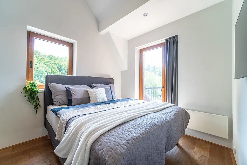 Další místností je útulná ložnice (15 m2) s relaxačním koutem a křeslem. Komfortní bydlení poskytuje moderní koupelna se sprchovým koutem (4,7 m2). Apartmán je vzdušný a hodně světlý. Panuje zde klid a pohoda.