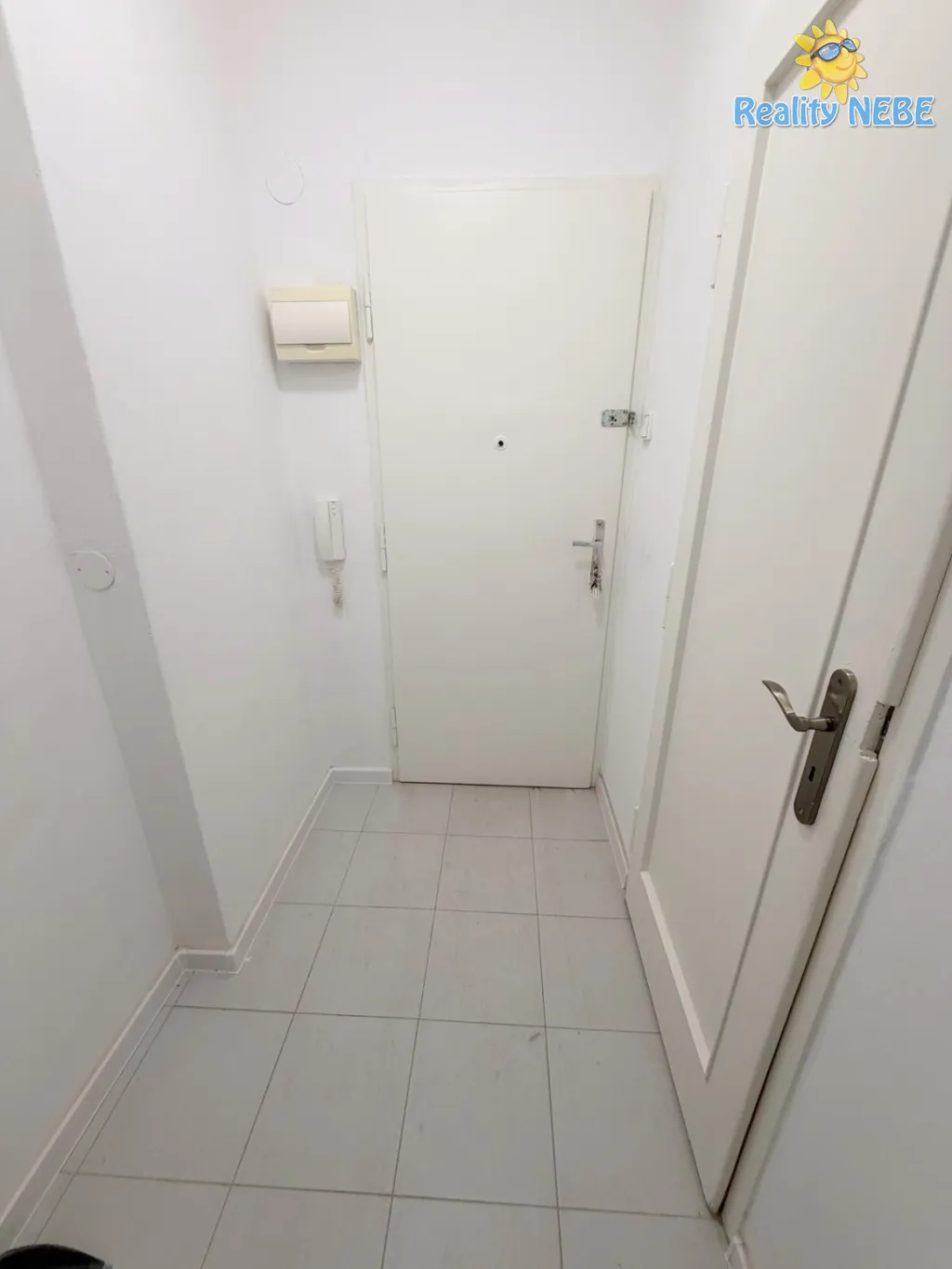 Nabízen je jako kompletně zařízený dle fotografií, tvoří jej obytný pokoj s kuchyňským koutem (linka se spotřebiči a lednice zůstávají), dále koupelna se sprchovým koutem, WC a pračkou.