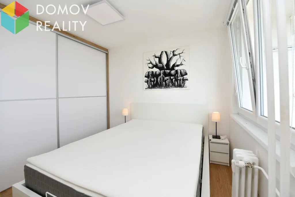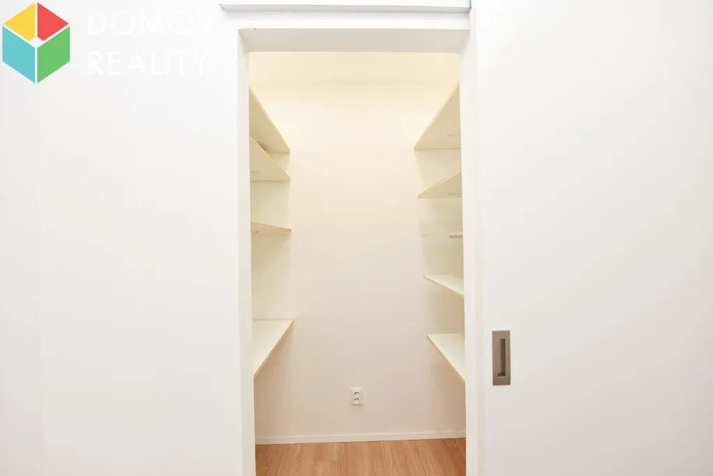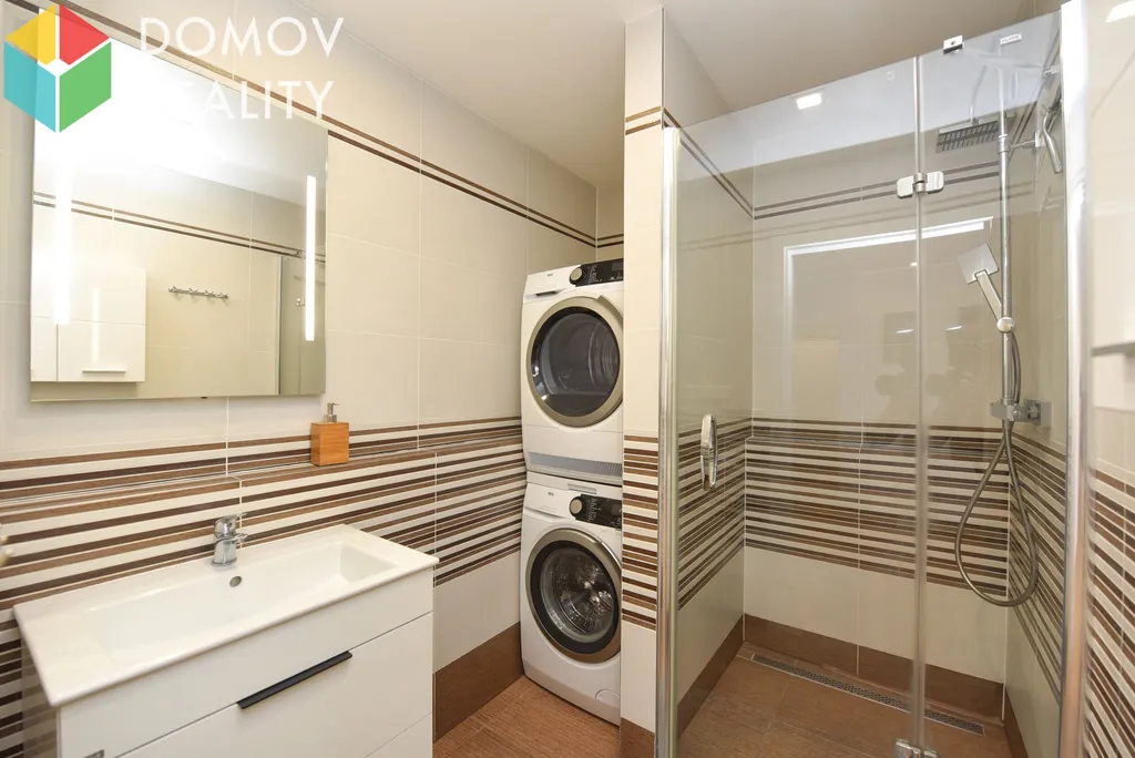 Dále byt nabízí ložnici s vestavěnými skříněmi a televizí, elegantní koupelnu se sprchovým koutem, pračkou se sušičkou, samostatné WC a praktickou komoru ve vstupní chodbě vybavenou regály.