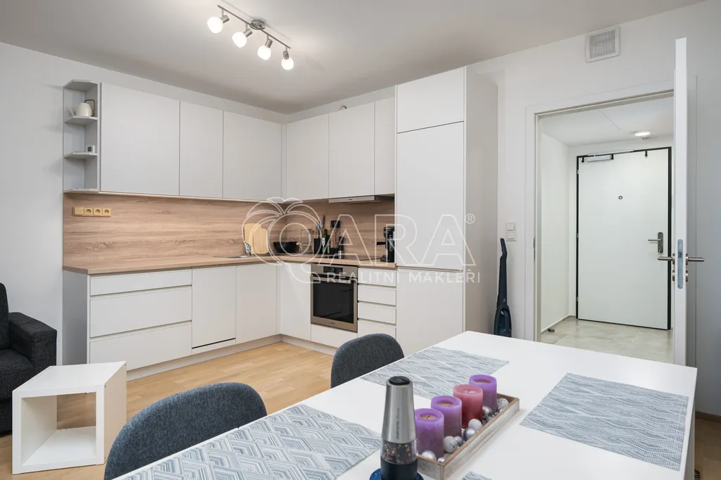 Vstupní chodba s vestavěnou skříní nabízí dostatek úložného prostoru. Dominantou bytu je velký obytný prostor, kde je kuchyňský kout prakticky oddělen od obývací části, díky čemuž byt působí vzdušně a otevřeně. Z obytné části je přímý vstup na terasu, ideální pro ranní kávu nebo večerní relax.