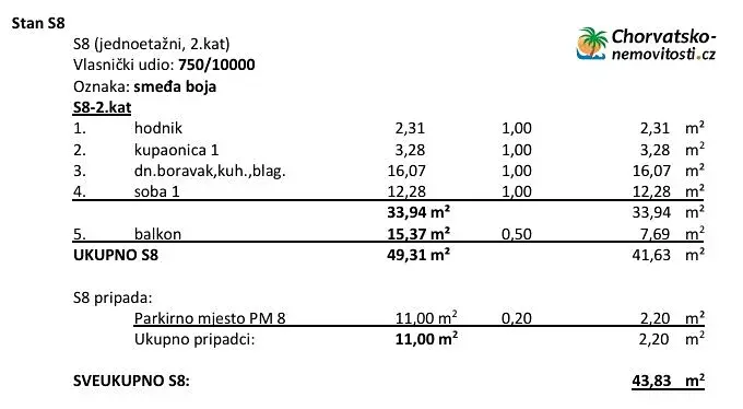Na prodej je dvoupokojový apartmán (S8) o celkové rozloze 43,83 m2 ve druhém patře novostavby v Povljaně, nedaleko pláže Dubrovník.