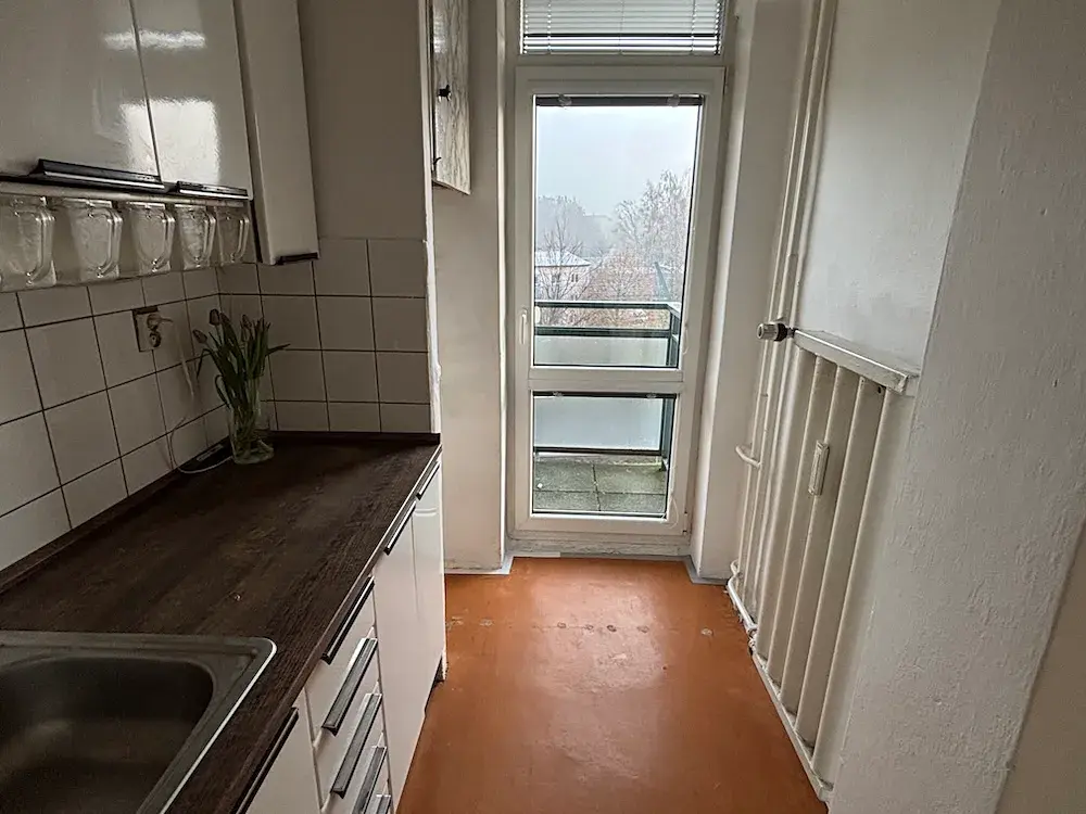 Dispozice bytu: kuchyň s balkónem, pokoj, předsíň s vestavěnými skříněmi, koupelna, WC.