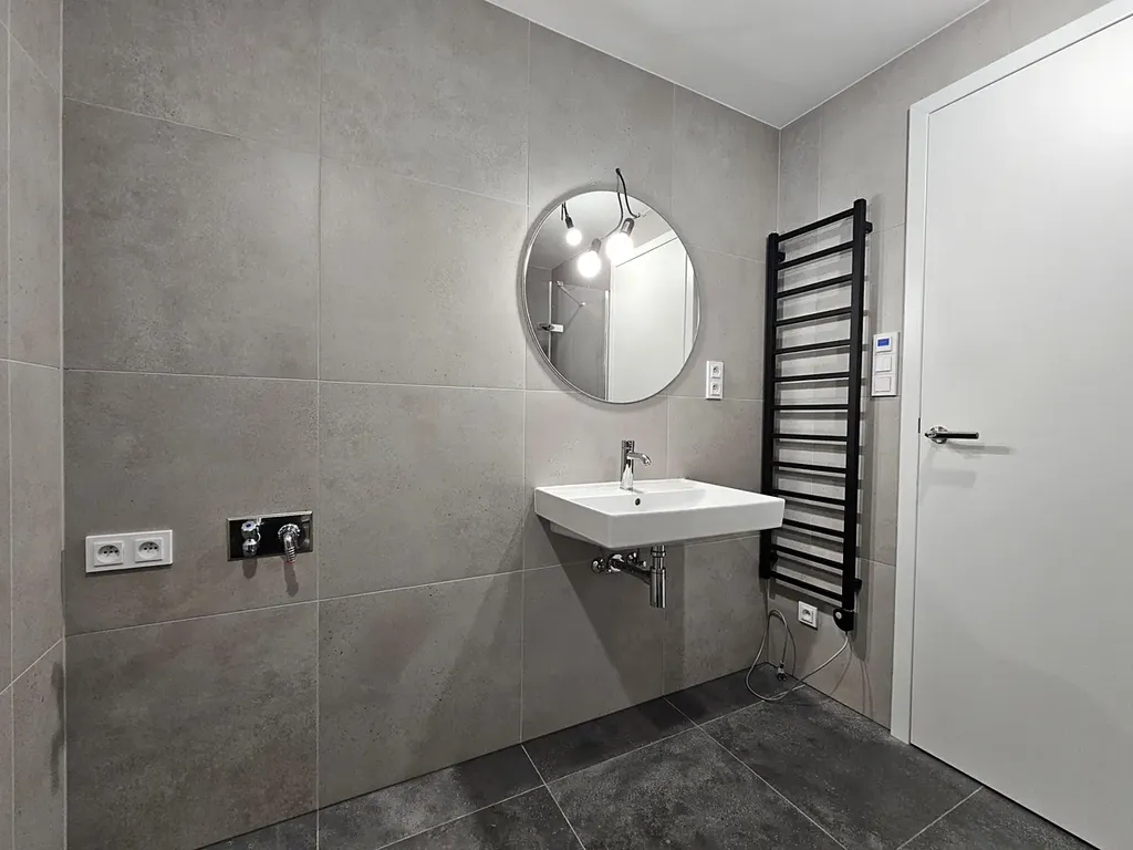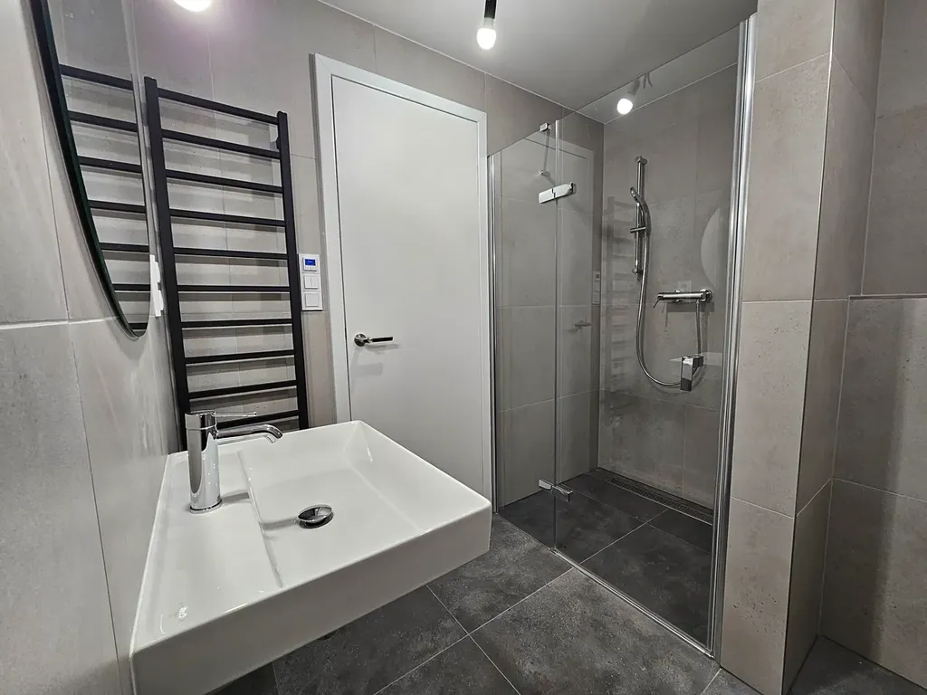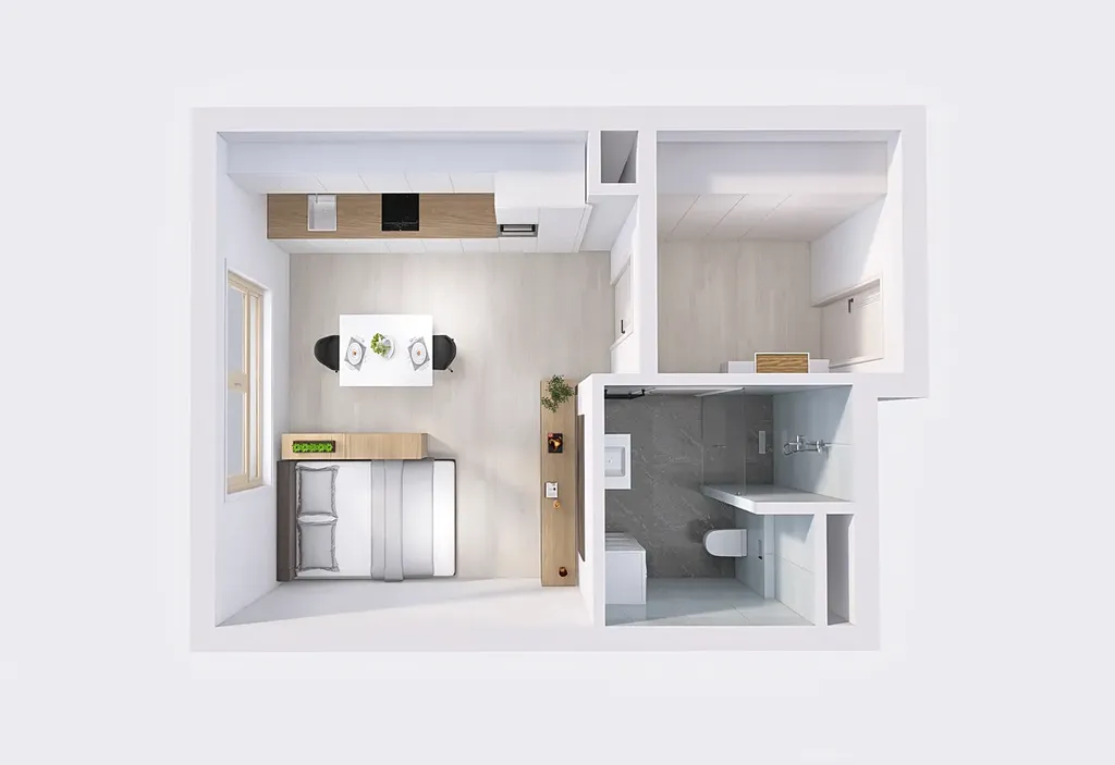 Byt se skládá z prostorné předsíně, koupelny s WC a sprchovým koutem walk-in, a obývacího pokoje s kuch. linkou. Okno je dřevěné s trojsklem. Bonusem jsou automatické předokenní žaluzie, které zvyšují soukromí i tepelný komfort v letních měsících. Podlahové krytiny tvoří vinyl a velkoformátová ker. dlažba v koupelně. Topení je podlahové. V bytě aktuálně probíhají dokončovací práce. K dispozici bude moderní kuch. linka s vestavěnými spotřebiči, vestavěná šatní skříň a podumyvadlová skříňka.