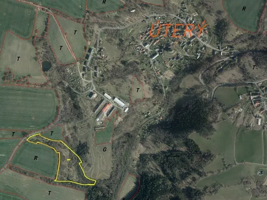 Předmětem dražby je pozemek o výměře 34 244 m2 v obci Úterý. Obec je vzdálena 39 km