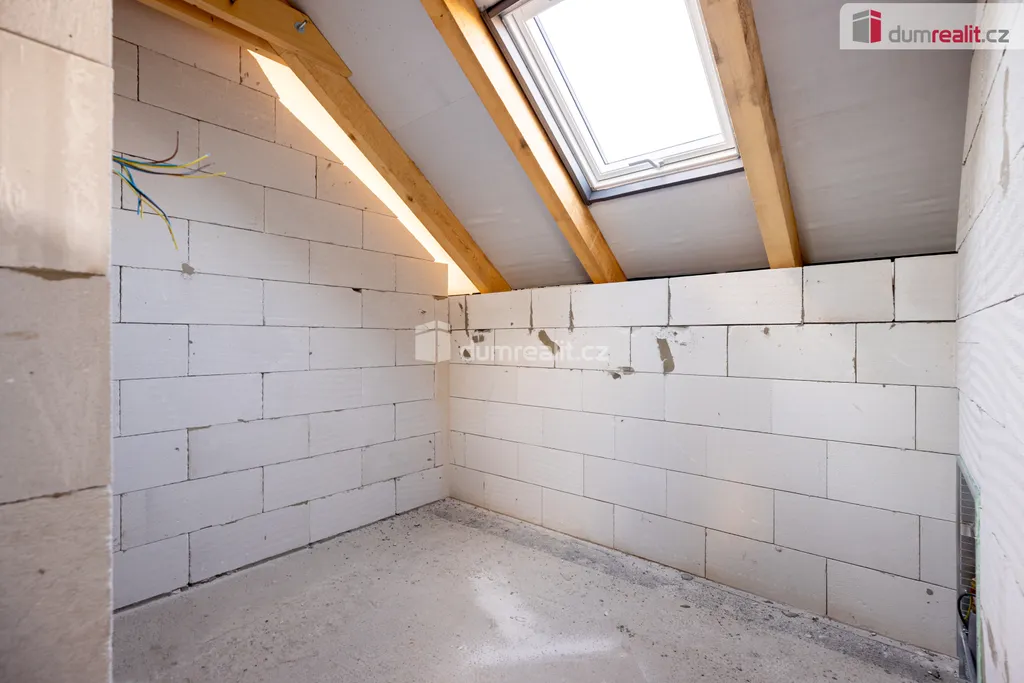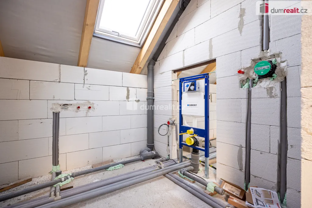 V patře domu, pod střechou (stříkaná izolace) jsou dva velké pokoje, další koupelna, toaleta a šatna.