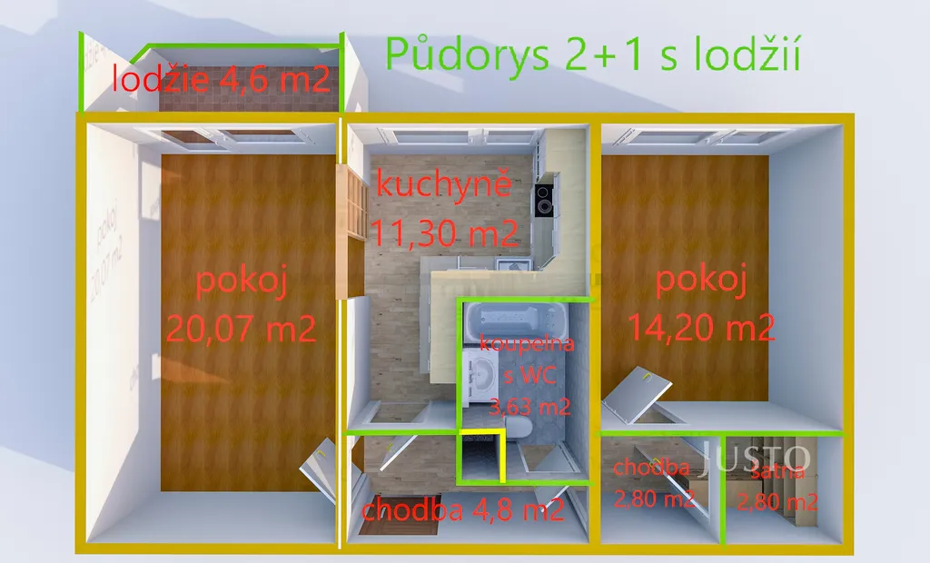 Byt má lodžii o velikosti 4,6 m², která nabízí příjemný výhled do okolní zeleně, a sklep o rozloze 2 m² pro uskladnění sezónních věcí, obojí se nezapočítává do výměry bytu.