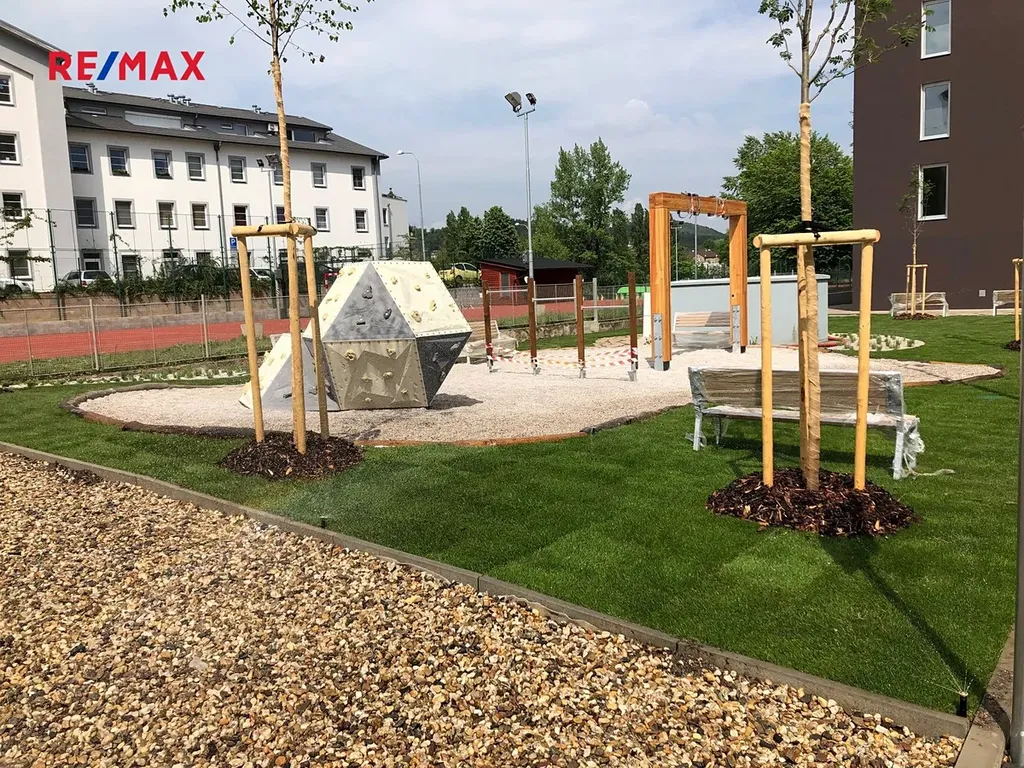 V uzavřeném vnitrobloku za domem se nachází dětské hřiště, zelená plocha a lavičky přístupné pouze pro obyvatele domu.
