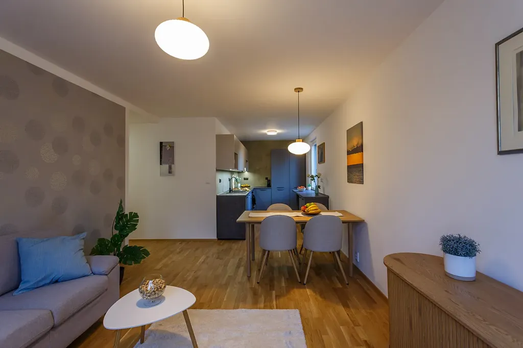 Dispozice: předsíň, chodba, samostatné WC, koupelna, technická místnost, dvě ložnice (jedna se vstupem na zasklenou lodžii), prostorný obývací pokoj s kuchyňským koutem. Kuchyň je vyrobena na míru a vybavena značkovými spotřebiči. K bytu náleží sklep, možnost využití kolárny. Dům má pouze 10 bytů, dobře fungující SVJ, bez půjček, dostatečné zdroje ve fondu oprav.