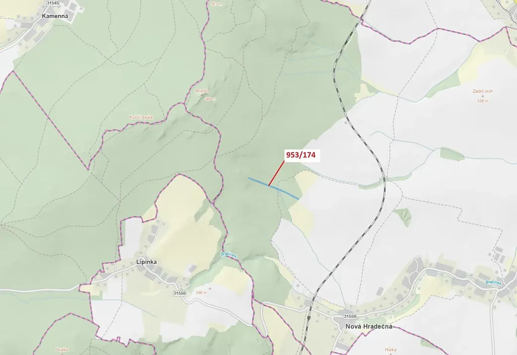 Lesní pozemek o výměře 6275 m2, parcelní číslo 953/174, podíl 1/1, katastrální území Nová Hradečná, obec Nová Hradečná, obec s rozšířenou působností Uničov, okres Olomouc, Olomoucký kraj.