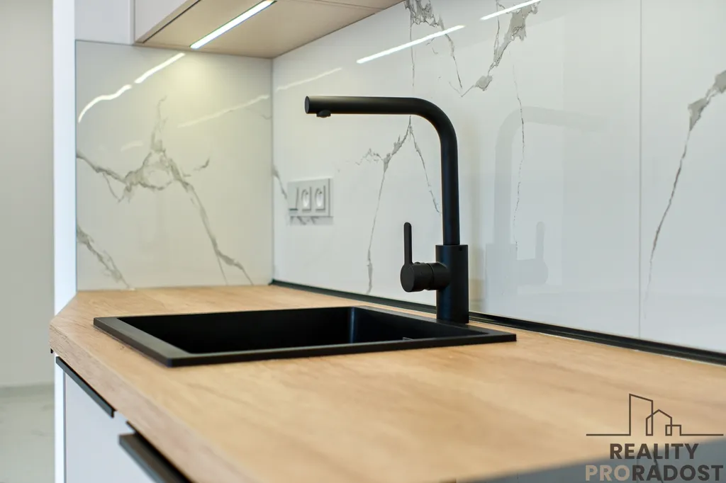 Kuchyňská linka vyrobená na míru kombinuje dekory kašmírově šedé a dubu Nebrasky. Vestavěné spotřebiče v kontrastní černé barvě (lednice s mrazákem, trouba, indukční deska, odsavač par s uhlíkovým filtrem) jsou značky Whirpool v kontrastní černé barvě, granitový dřez Franke. Kombinuje se zde systém otevírání pomocí úchytek a tip on systému, kovaní je použito od značky Blum. Pod horními skříňkami je LED osvětlení. Za pracovní deskou je použit velkoformátový obklad v dekoru mramoru.