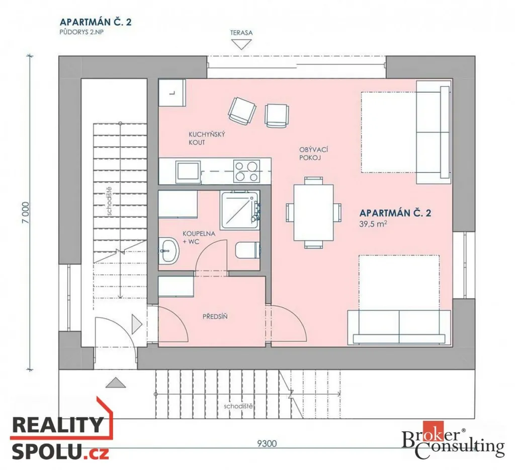 Apartmán II: Přímý výstup na velkou terasu. Obývací pokoj se dvěma rozkládacími gauči (plnohodnotná dvoulůžka) – celkem 4 lůžka. Koupelna se sprchovým koutem a toaletou, kuchyňský kout a jídelna.