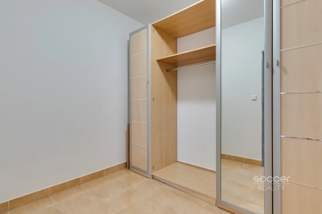 Součástí bytu je také samostatná místnost využívaná jako šatna se skříní, která nabízí dostatek úložného prostoru. Koupelna je vybavena sprchovým koutem a koupelnovým nábytkem, k dispozici je prostor pro pračku. Toaleta je oddělená. K bytu náleží garážové stání v suterénu domu, které zajišťuje pohodlné parkování.