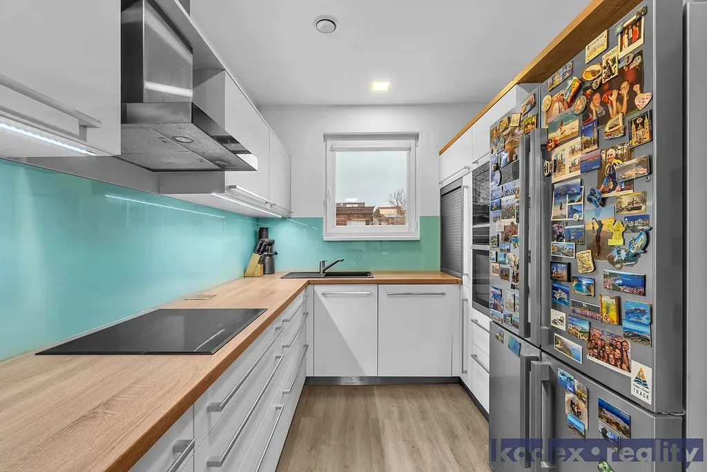 Dispozice: krytý vstup, zádveří s vestavěnou skříní a technickou místností, obytná místnost s kuchyňským koutem se spíží, chodba s přístupem na půdu, koupelna s vanou, sprchovým koutem a saunou, komora, ložnice, dětský pokoj a pracovna a krytá terasa. Vedle RD stojí dílna a sklad na kola, motorky apod. Před domem je postaveno velké garážové stání pro 2-3 auta včetně dodávky. Pozemek je kompéletně oplocen a vpředu je elektricky ovládaná vjezdová brána. Okrasná zahrada je vybavena zavlažovacím systémem, venkovní sprchou, bazeném a krytou terasou.