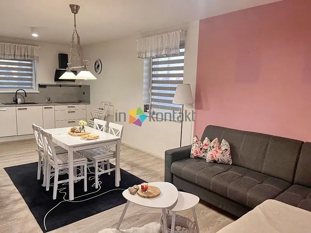 prostorný obývací pokoj s kuchyňským koutem, ložnice, šatna, koupelna s vanou i sprchovým koutem, samostatné WC, zádveří, chodba