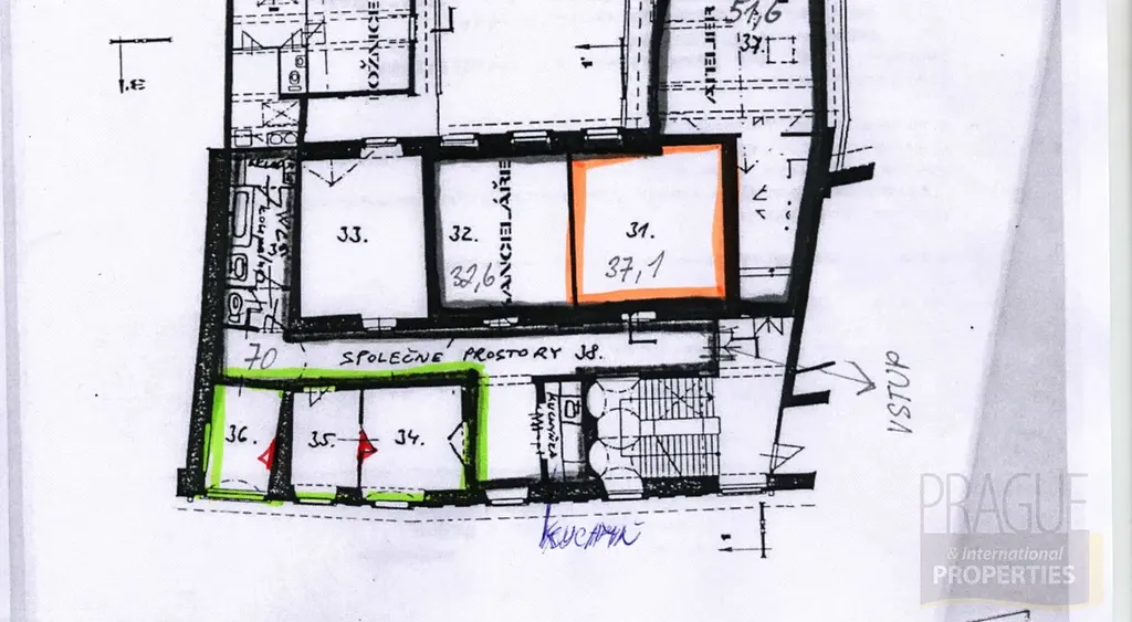 Pronájem reprezentativní kanceláře v samém srdci Prahy, jen pár kroků od Staroměstského náměstí. Melantrichova 970. Kancelář se nachází ve 3. patře historického domu a nabízí celkem 35m2 plochy. Prostory jsou dispozičně řešeny jako 3 jednotlivé malé kanceláře, které mají samostatný vstup ale jsou i průchozí. Součástí je sdílená kuchyně, toalety. Středem vede chodba. Prostory jsou zabezpečeny alarmem, podlahy parketové. Poloha poskytuje výbornou dopravní dostupnost - stanice metra Můstek, Staroměstská i blízkost mnoha obchodů a restaurací.