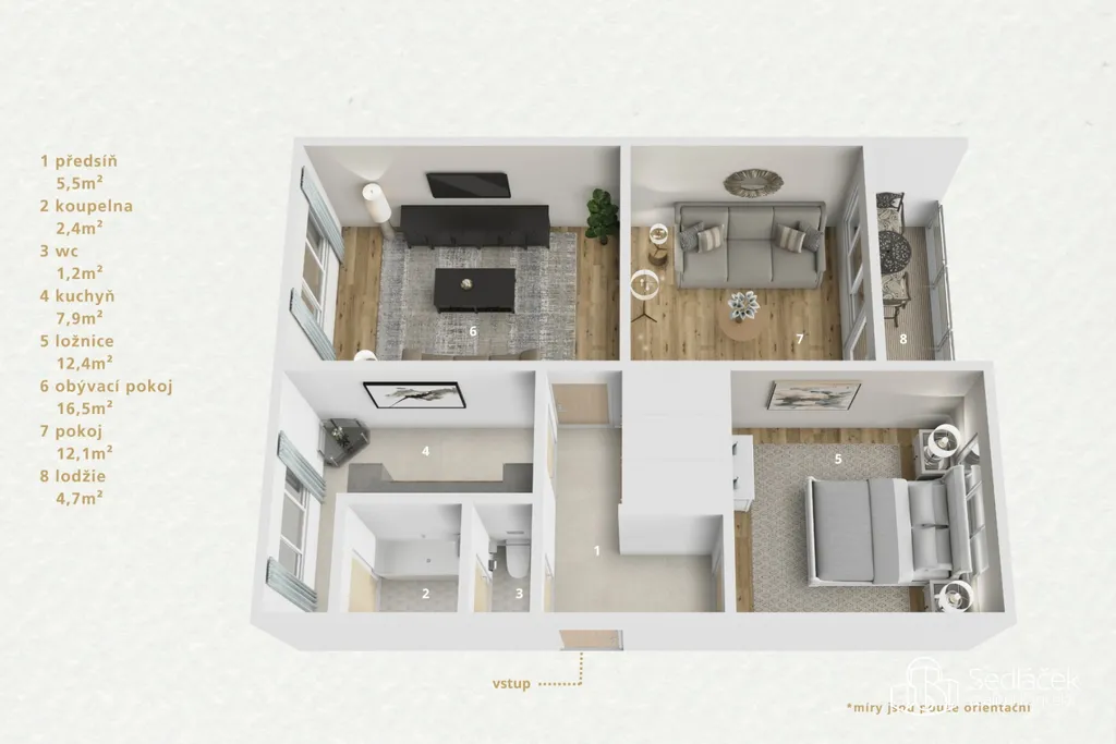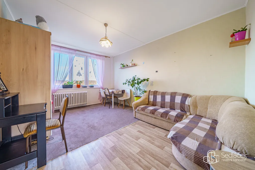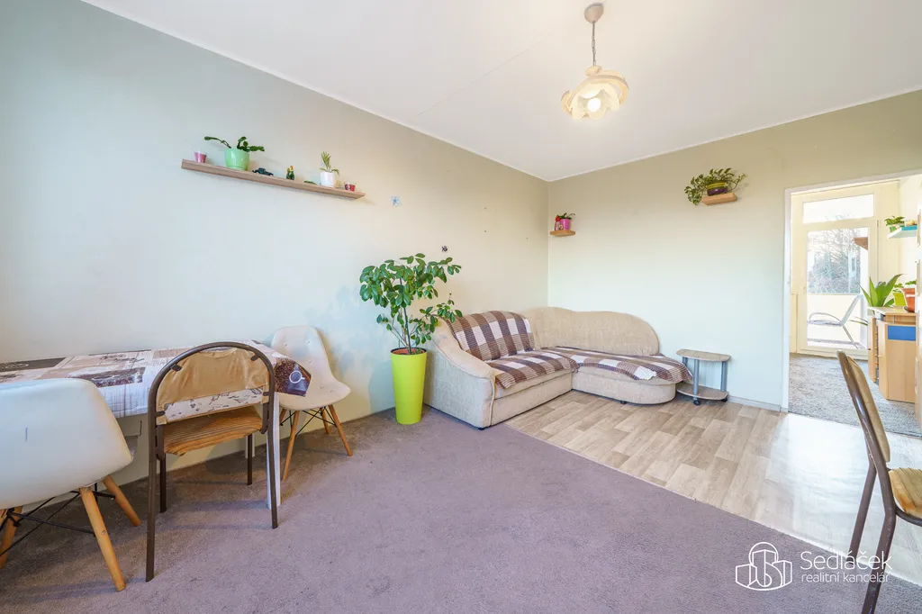 Pokoje jsou světlé a dobře využitelné, přičemž obývací pokoj tvoří přirozené centrum bytu. Lze do něj vstoupit jak přímo z kuchyně, tak z předsíně, což zvyšuje praktičnost celého uspořádání. Prostorná lodžie pak nabízí příjemné místo k posezení i relaxu.