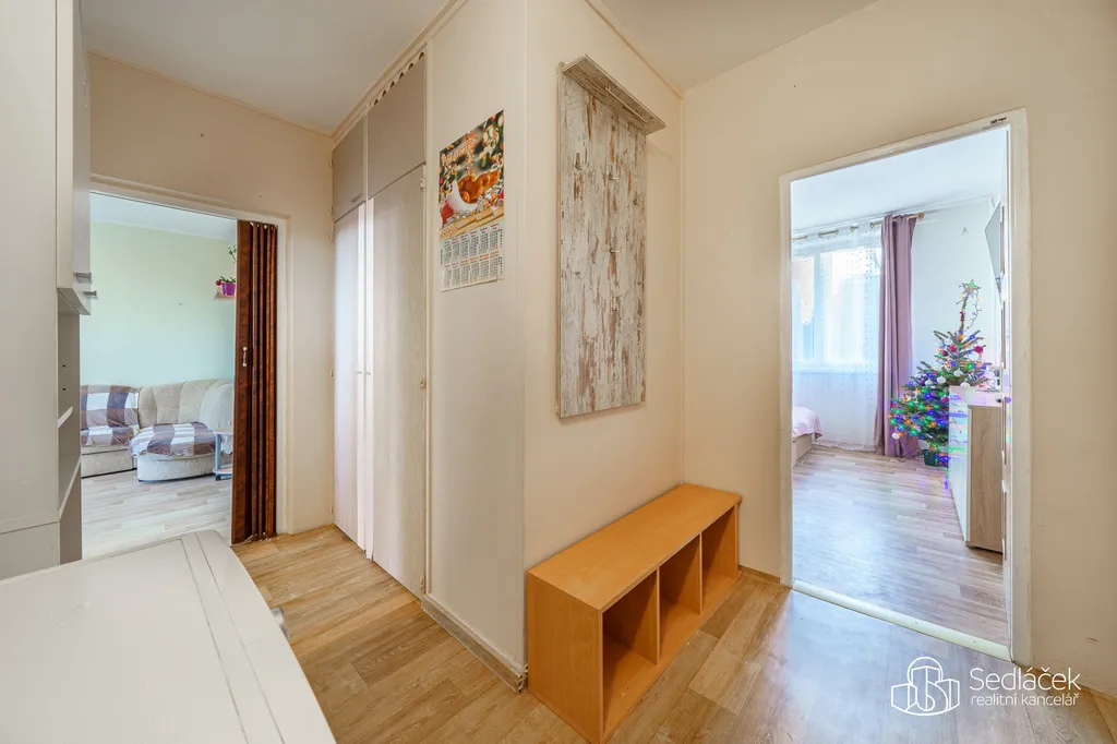 Už při příchodu je patrné, že byt nabízí dostatek prostoru a klidu. Předsíň s vestavěnými skříněmi je praktická a přehledná, ideální pro každodenní život. Výhodou bytu je také fakt, že nad ním nejsou žádní sousedé, což výrazně přispívá ke klidnému bydlení.