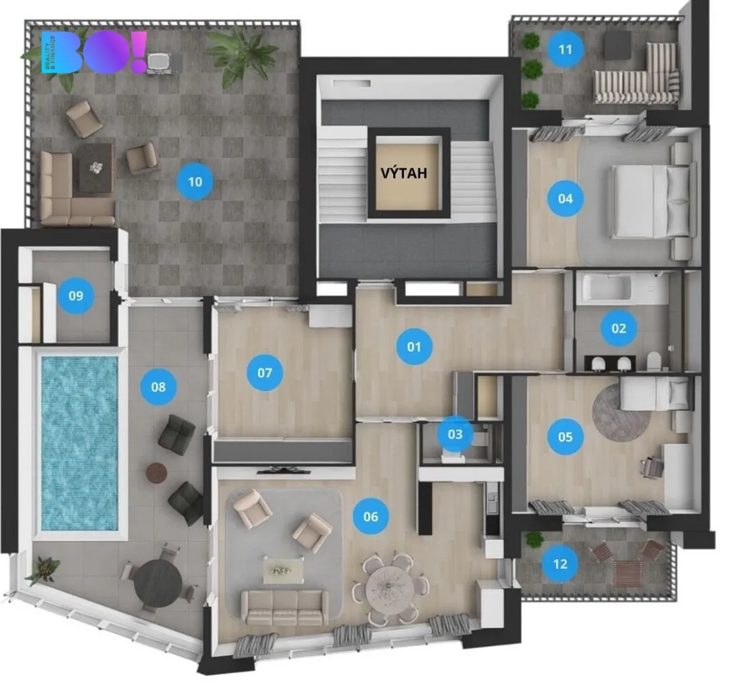 Byt s bazénem 182,3 m² s terasy 81,24 m² a sklepem 4,58 m² je šikovně dispozičně řešen tak, aby nabízel dostatek prostoru pro komfortní bydlení i reprezentativní pracovní zázemí.