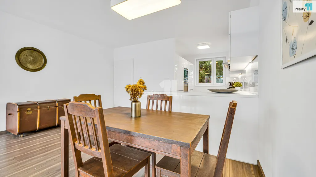 Hlavní obytné podlaží tvoří otevřený prostor o výměře přibližně 50 m², který propojuje obývací pokoj, jídelní část a kuchyňský kout se samostatným oknem. Velkoformátová okna orientovaná na jihovýchod zajišťují dostatek denního světla a příjemnou atmosféru. Z obývací části je přímý vstup na prostornou terasu s otevřeným výhledem, která je schodištěm propojena se zahradou. Na stejném podlaží se nachází vstupní hala se schodištěm a samostatná toaleta.