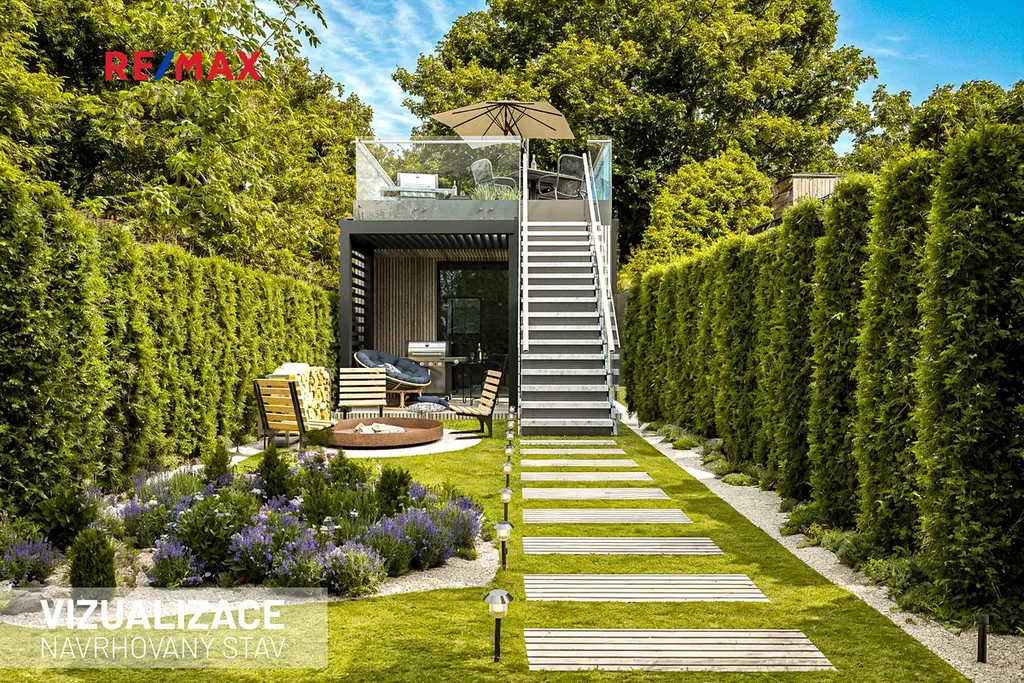 Zahrada je orientována na západ a nabízí příjemné místo k odpočinku a relaxaci. Celý pozemek o velikosti 177 m2 je kompletně oplocen. I když je dům nedaleko veškeré občanské vybavenosti, tak je zde ticho a klid. V blízkosti jsou mateřské školy, základní školy, střední školy, restaurace, obchody a služby, OBI, BILLA, 2x zastávka MHD a metra v dosahu krátké pěší chůze. Velmi dobrá dopravní dostupnost na Pražský okruh, nájezd na ul. Kbelská je 500m.
