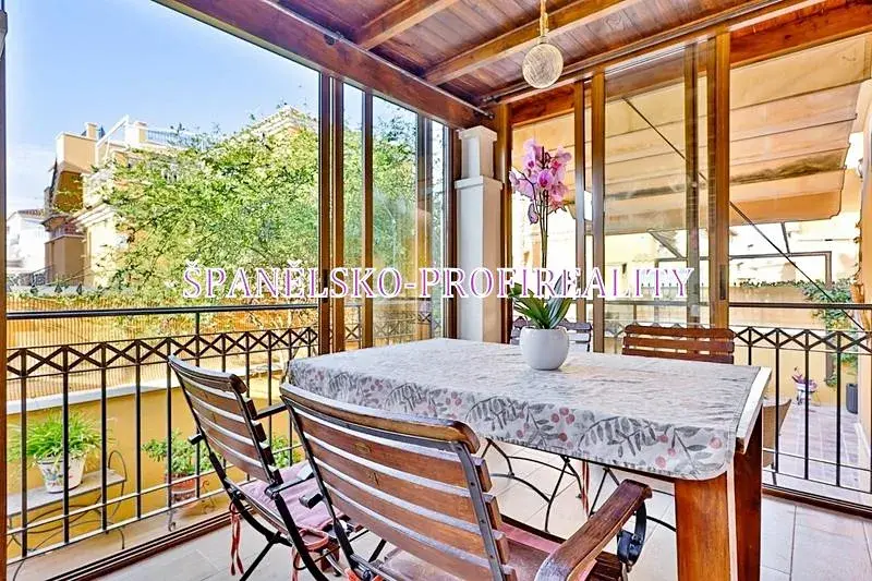 Venkovní zaskleněná terasa s posezením.