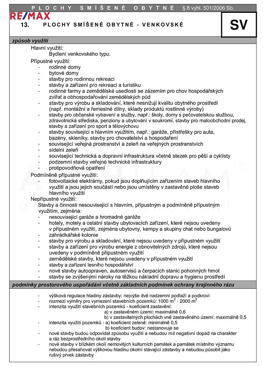• stavební pozemky: 7.831 m2 - SV (Z203) – Plochy smíšené obytné – venkovské; rozparcelováno na šest parcel a cestu. V případě zájmu je možné koupit pouze tento stavební pozemek. Více informací u makléřky nemovitosti.