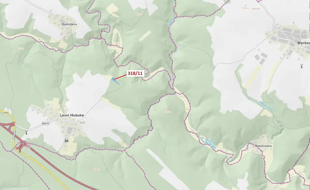 Lesní pozemek o výměře 3838 m2, parcelní číslo 318/11, podíl 1/1, katastrální území Lesní Hluboké, obec Lesní Hluboké, obec s rozšířenou působností Rosice, okres Brno-venkov, Jihomoravský kraj. Po těžbě.