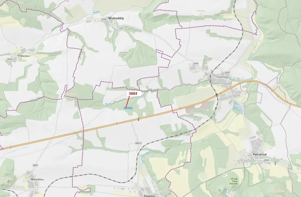 Lesní pozemek o výměře 7 695 m2, parcelní číslo 3884, podíl 1/1, katastrální území Stebno u Petrohradu, obec Kryry, obec s rozšířenou působností Podbořany, okres Louny, Ústecký kraj. Částečně po těžbě.