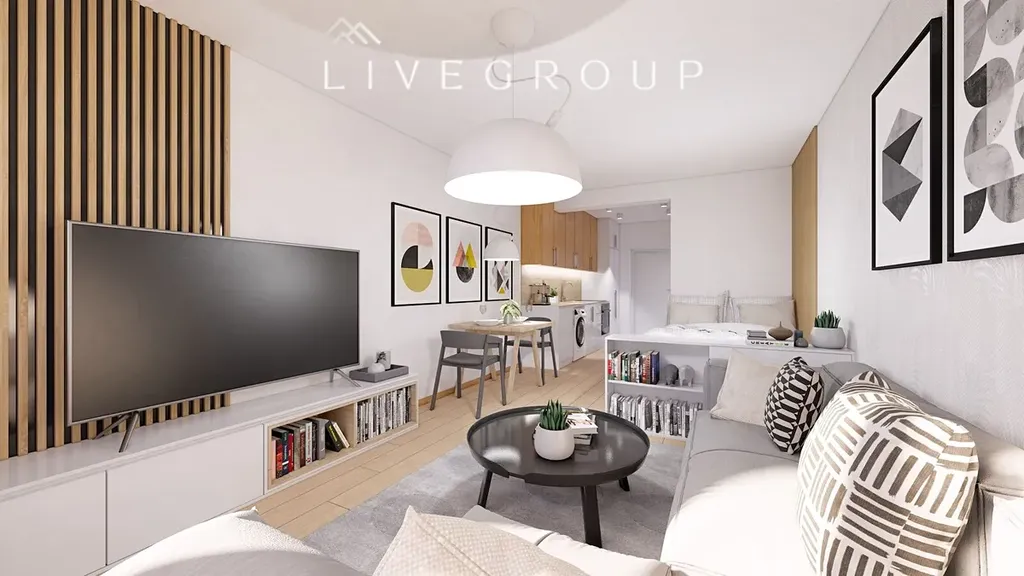Byt s orientací na jih tvoří prostorná předsíň s místem pro vestavěnou skříň, obývací pokoj spojený s kuchyňským koutem i místem pro vybudování částečně oddělené ložnice o celkové velikosti 26,65 m2, koupelna se sprchovým koutem a toaletou 4,8 m2.