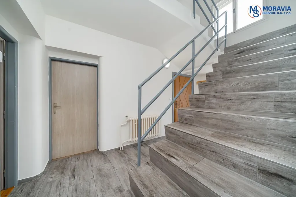 První patro nabízí dva samostatné pokoje, z nichž každý má vlastní kuchyňský kout. Tato dispozice je perfektní pro vícegenerační bydlení nebo pro rozdělení kancelářských prostor mezi různé týmy. Společná koupelna na patře je praktická pro všechny obyvatele či zaměstnance.