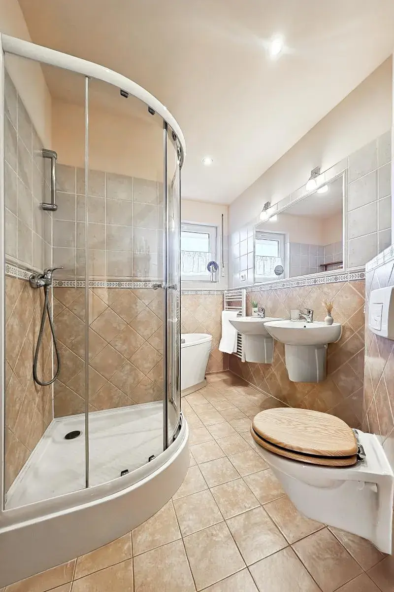 Dům je řešen jako bezbariérový, celý v jedné úrovni. Dispozice zahrnuje tři samostatné ložnice, koupelnu s rohovou vanou, 2 umyvadla, WC, sprchový kout a ještě samostatné WC.