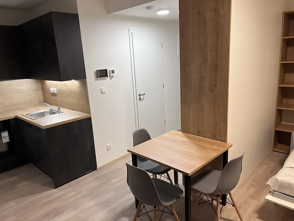 Exkluzivní nabídka útulného bytu s otevřenou dispozicí o rozloze 25m2 a 16m2 terasou s krasným výhledem, v novostavbě Rezidence MyMOZART. Bytu dominují masivní protihluková hliníková okna s francouzskými dveřmi, chráněná roletou a dále zejména nádherná, prostorná terasa s venkovní markýzou. Má klimatizaci a další věcí, zpříjemňující váš pobyt. Byt je vhodný pro jednu až dvě osoby, je umístěný tak, že poskytuje maximální soukromí. Za pár minut si nakoupíte, zajdete do blízké posilovny nebo nákupního centra, auto nepotřebujete, vše je skvěle dostupné MHD nebo pěšky.