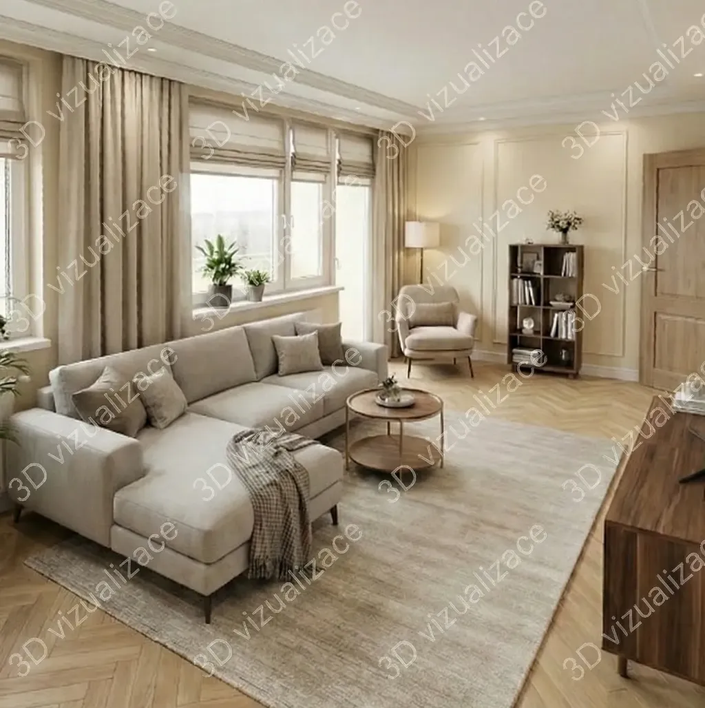 Dispozice 3+1: Dominantou je obývací pokoj (18,8 m²), doplněný dvěma ložnicemi (12,3 m² a 12,5 m²), samostatnou kuchyní (12,5 m²) a velkorysou předsíní (14 m²).