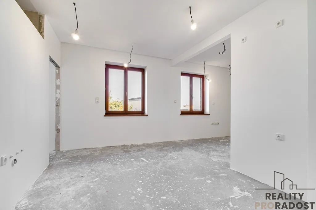 Osvětlení v LED technologii, nové měděné elektroinstalace, příprava pro kuchyňské spotřebiče i digestoř, betonový podklad pro podlahu – vše čeká na finální designový dotek nového majitele.