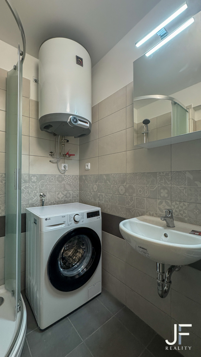 V koupelně se sprchovým koutem a elektrickým bojlerem je k dispozici mimo jiné pračka.