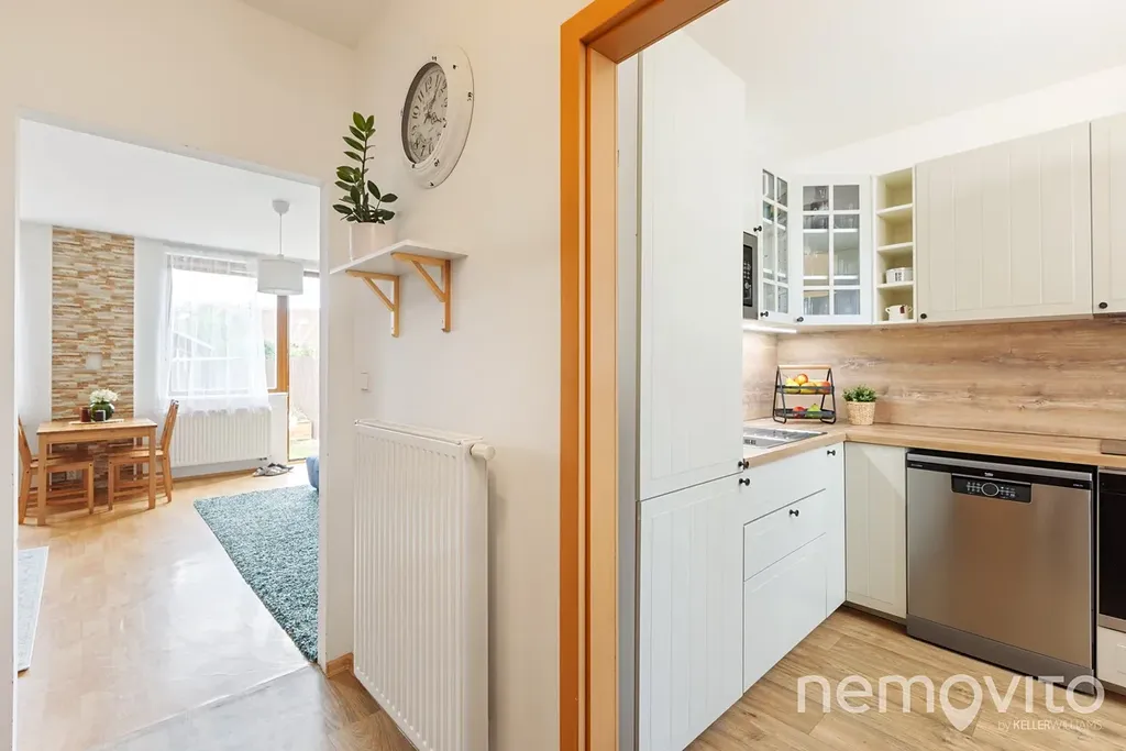 Vymezen je jako bytová jednotka v RD (celkem 3 jednotky) a dle prohlášení vlastníka má plochu 74 m2, díky úpravám podkroví je však plocha po přeměření 87 m2. Další z úprav pak byl přesun kuchyně do samostatné místnosti s oknem, díky čemuž je obývák (28 m2) skutečně prostorný. Vstup na zahradu je možný jak z obýváku, tak zezadu přes vrátka. Nová kuchyně (10 m2) s oknem je umístěna u vstupu směrem do ulice, naproti je pak samostatné WC a nová koupelna s velkým sprchovým koutem.