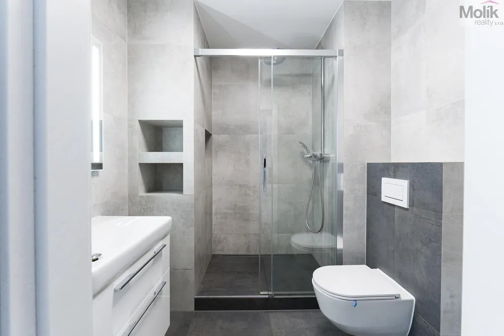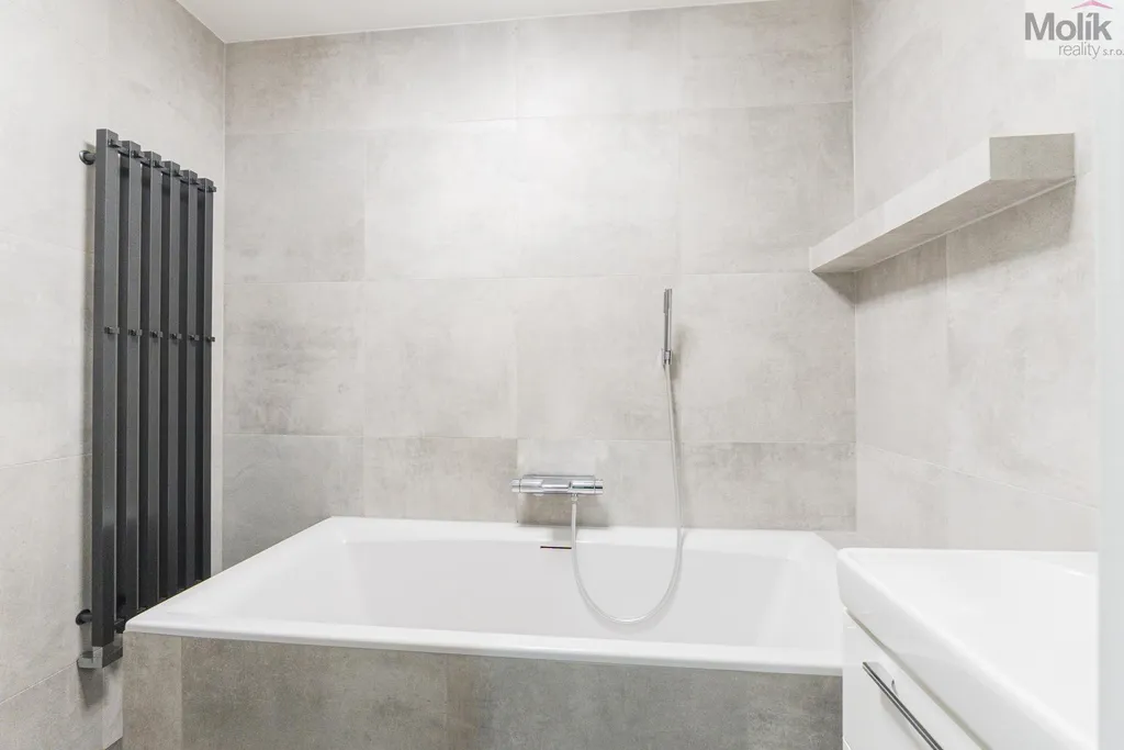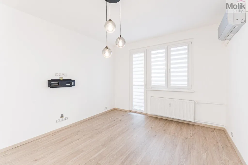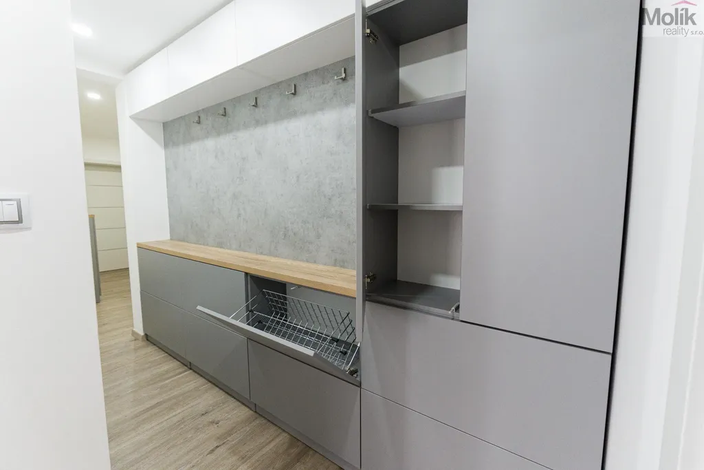 Byt je po kompletní rekonstrukci (kuchyňská linka, elektřina, 2x zděné jádro, podlahy, dveře, praktická šatna, dvě koupelny..)
