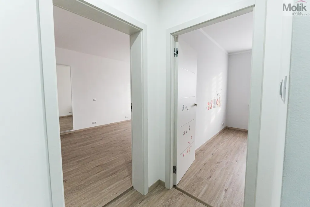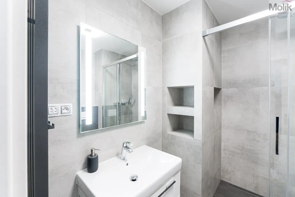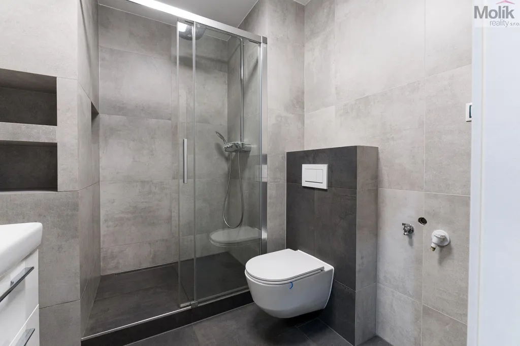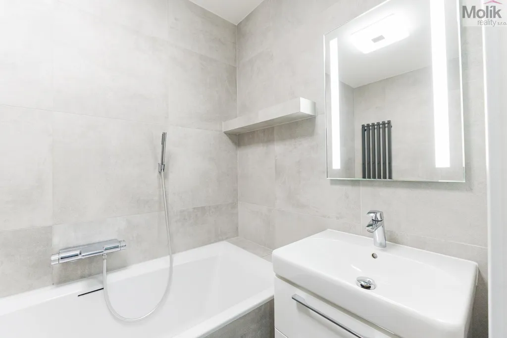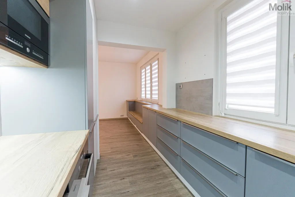 Byt je po kompletní rekonstrukci (kuchyňská linka, elektřina, 2x zděné jádro, podlahy, dveře, praktická šatna, dvě koupelny..)