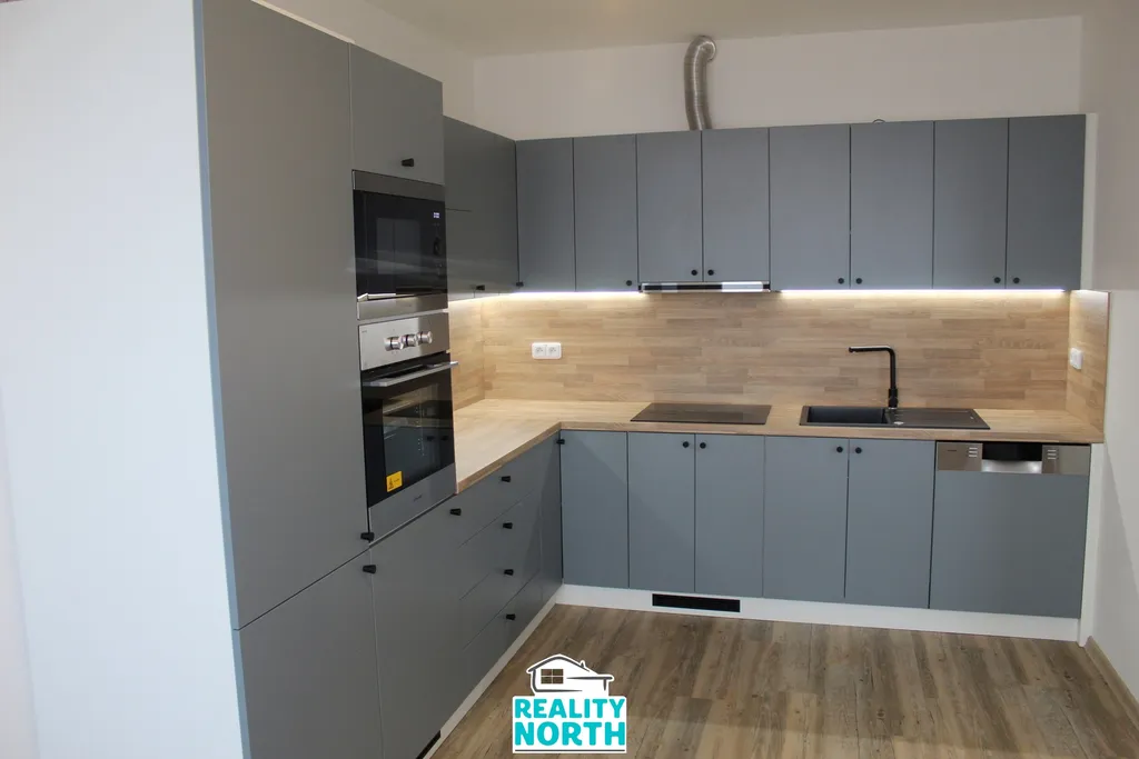 Nová kuchyňská linka s vestavěnými spotřebiči- elektrická trouba, indukční deska, mikrovlnná trouba, myčka.