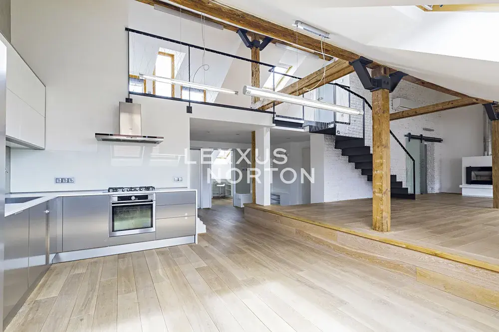 Moderní světlý mezonet s dispozicí 5+kk a celkovou plochou 192 m² splňuje všechny nároky na moderní a komfortní životní styl. Nemovitost se nachází na 5. nadzemním podlaží. Spodní úroveň bytu zahrnuje vstupní halu, světlý obývací pokoj s krbem, plně vybavený kuchyňský kout, dvě ložnice, dvě koupelny a praktickou šatnu. Na vyvýšené galerii se nachází další ložnice, koupelna a kompaktní místnosti sloužící jako úložné prostory. Z galerie máte přístup na prostornou terasu, odkud se vám nabízí dechberoucí pohled na město i do klidného vnitrobloku plného zeleně. Byt je plně klimatizován a vybaven inteligentní domácností.