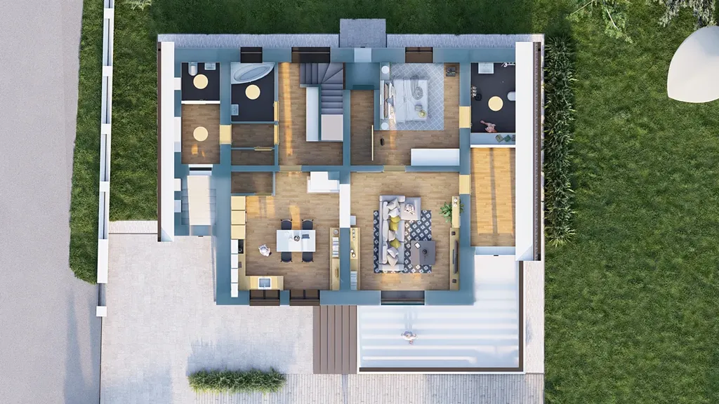 V přízemí se nachází 5x místnost, 2 x veranda (dle svého uvážení), koupelna, WC. V půdním prostoru je volný prostor k možnému dalšímu vystavění 3 pokojů a soc. zázemí. Po stavebních úpravách by mohl dům být využíván v přízemí 2+1 nebo 3+1 s možností vyjít na otevřenou verandu. V 1. patře by mohli být další 3 x místnosti se zázemím a s vnitřním schodištěm. Na pozemku by mohla být parkovací místa pro auta, oddechová část na posezení u krbu a venkovního bazénu. Dům je částečně podsklepený.