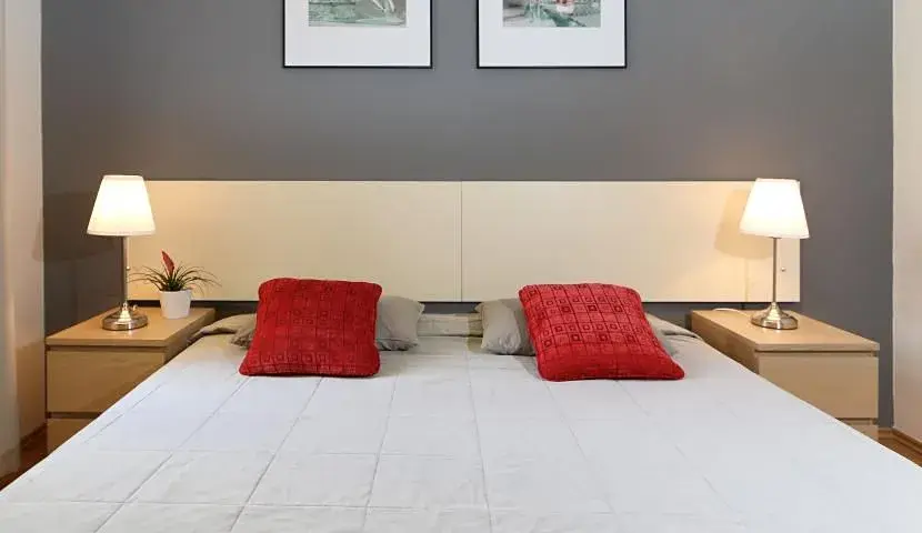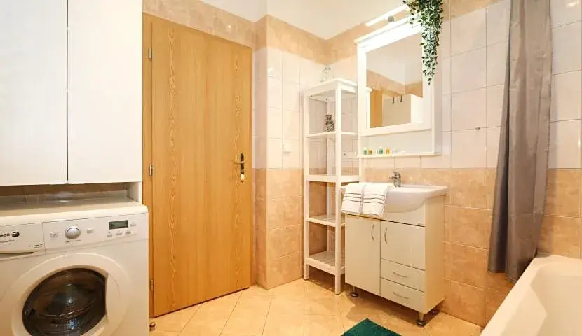 Interiér bytu nabízí vstupní chodbu, útulný obývací pokoj s televizí, jídelním prostorem a plně zařízenou kuchyní (lednice, trouba, myčka, mikrovlnka), dvě moderně zařízené ložnice a koupelnu s vanou, umyvadlem a toaletou.