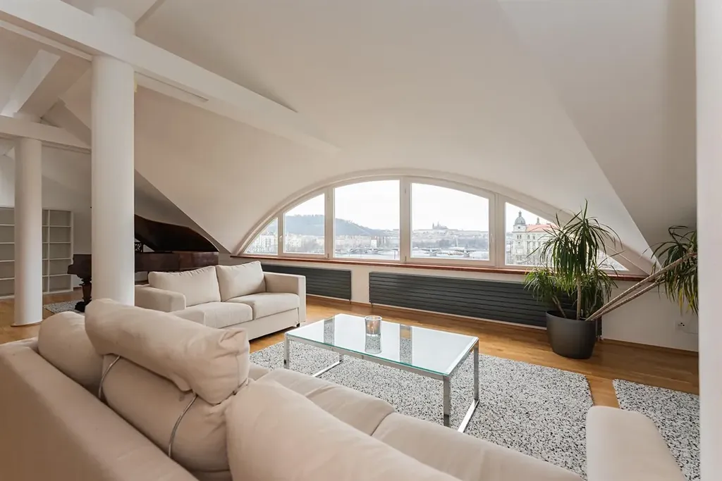 Luxusní prostorný mezonet s terasou a zimní zahradou, 5+kk (4 ložnice, 3 koupelny) o celkové rozloze 248 m2 je situovaný v 6. a 7. patře rezidenčního domu s výtahem. Byt nabízí obývací pokoj s plně vybavenou kuchyní (sporák/trouba, lednice, myčka) oddělenou skleněnou příčkou, 4 ložnice situované do klidné zóny vnitrobloku, 3 koupelny (sprcha, vana, bidet), 2x šatnu, komoru a prádelnu. Byt je vybaven nábytkem. Terasa a zimní zahrada jsou situované na jižní stranu. Nádherný výhled na Hradčany. SAT, telefonní linka a internet.