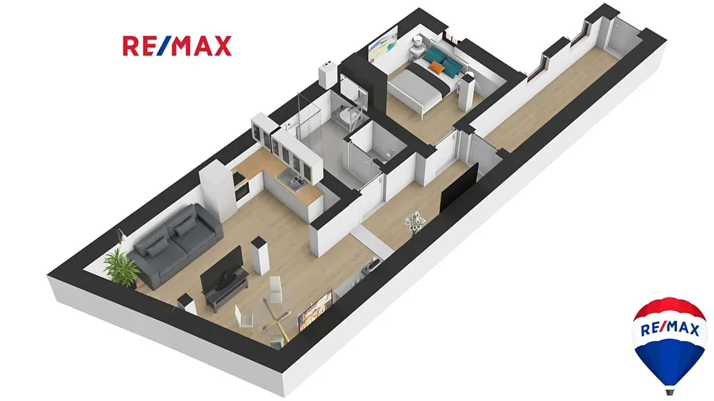 Byt o velikosti 75 m2 se nachází ve 3.NP bytového domu a je situován v podkroví, přičemž okna bytu nabízejí výhledy na náměstí T. G. Masaryka. Dispoziční řešení bytu je patrné z přiloženého půdorysného schématu a bytem se můžete projít prostřednictvím virtuální prohlídky. Byt je zařízen moderní kuchyňskou linkou včetně spotřebičů a disponuje prostornou vstupní chodbou, koupelnou, samostatnou toaletou, obývacím pokojem s kuchyní a ložnicí.