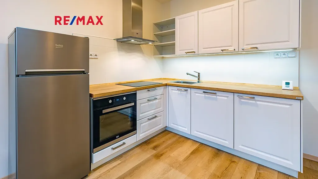Do prostoru kuchyně byla instalována na míru vyráběná rohová kuchyňská linka v bílé barvě s nerezovými úchytnými lištami v kombinaci s dubovou pracovní deskou, vybavená spotřebiči - pečící el. trouba, indukční varná deska, lednice s mrazničkou, myčka nádobí, digestoř.